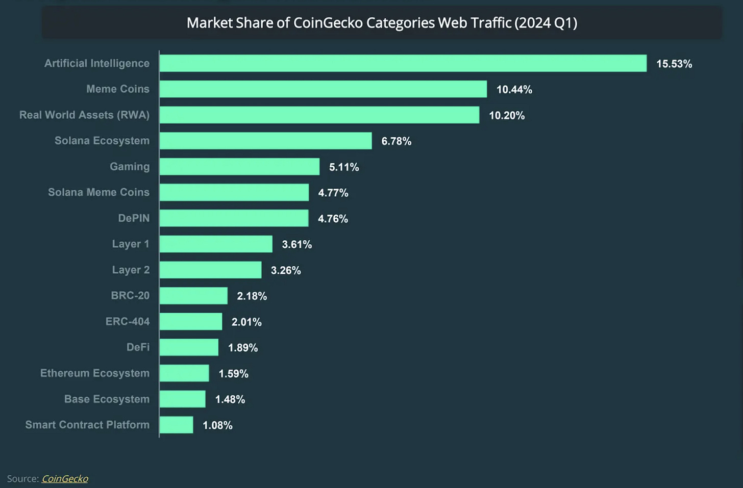 l'IA, les memecoins et les actifs réels (RWAs) ont été les trois principales narratives du trimestre. Ensemble, elles ont capturé un tiers de l'intérêt des investisseurs.
