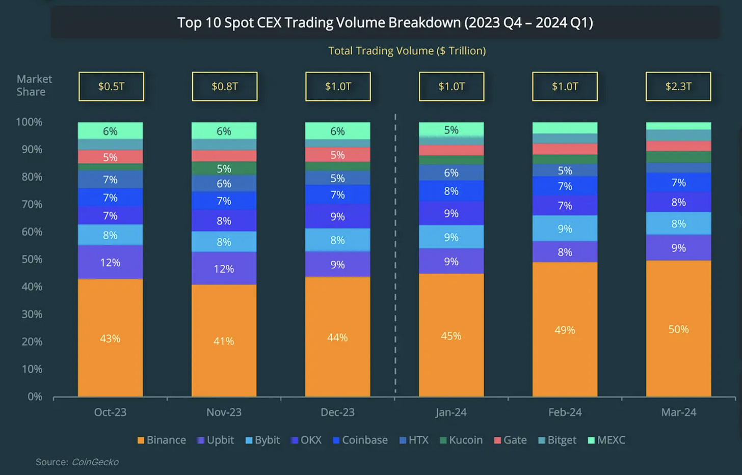 Les 10 principales bourses centralisées (CEX) enregistrent un volume de transactions au comptant de 4,29 billions de dollars. Cela représente une augmentation de +95,3 % par rapport au quatrième trimestre 2023 et le volume le plus élevé enregistré depuis 2021.