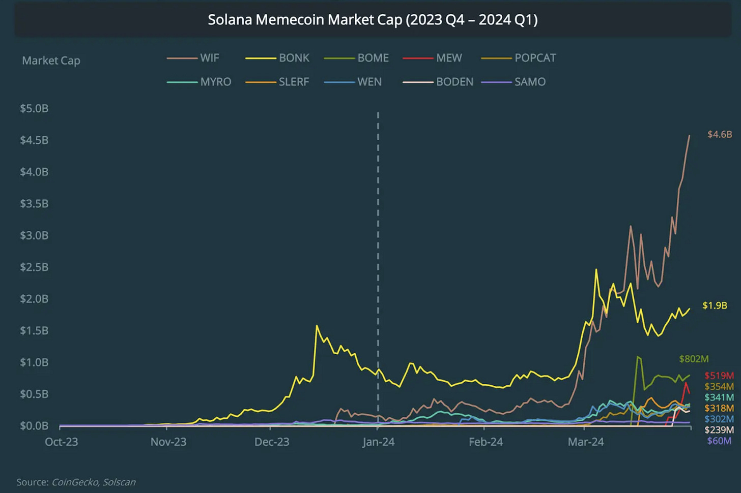 La capitalisation boursière des 10 principaux memecoins de Solana a augmenté de 8,3 milliards de dollars au premier trimestre. Cela représente une impressionnante augmentation de 801,5 % par rapport au quatrième trimestre 2023.