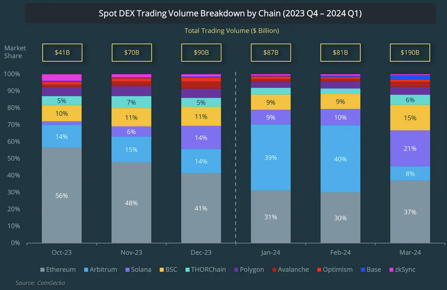 Les DEX sur Arbitrum ont vu une forte hausse au début du trimestre (largement due à son programme d'incitation), mais cela s'est atténué en mars.